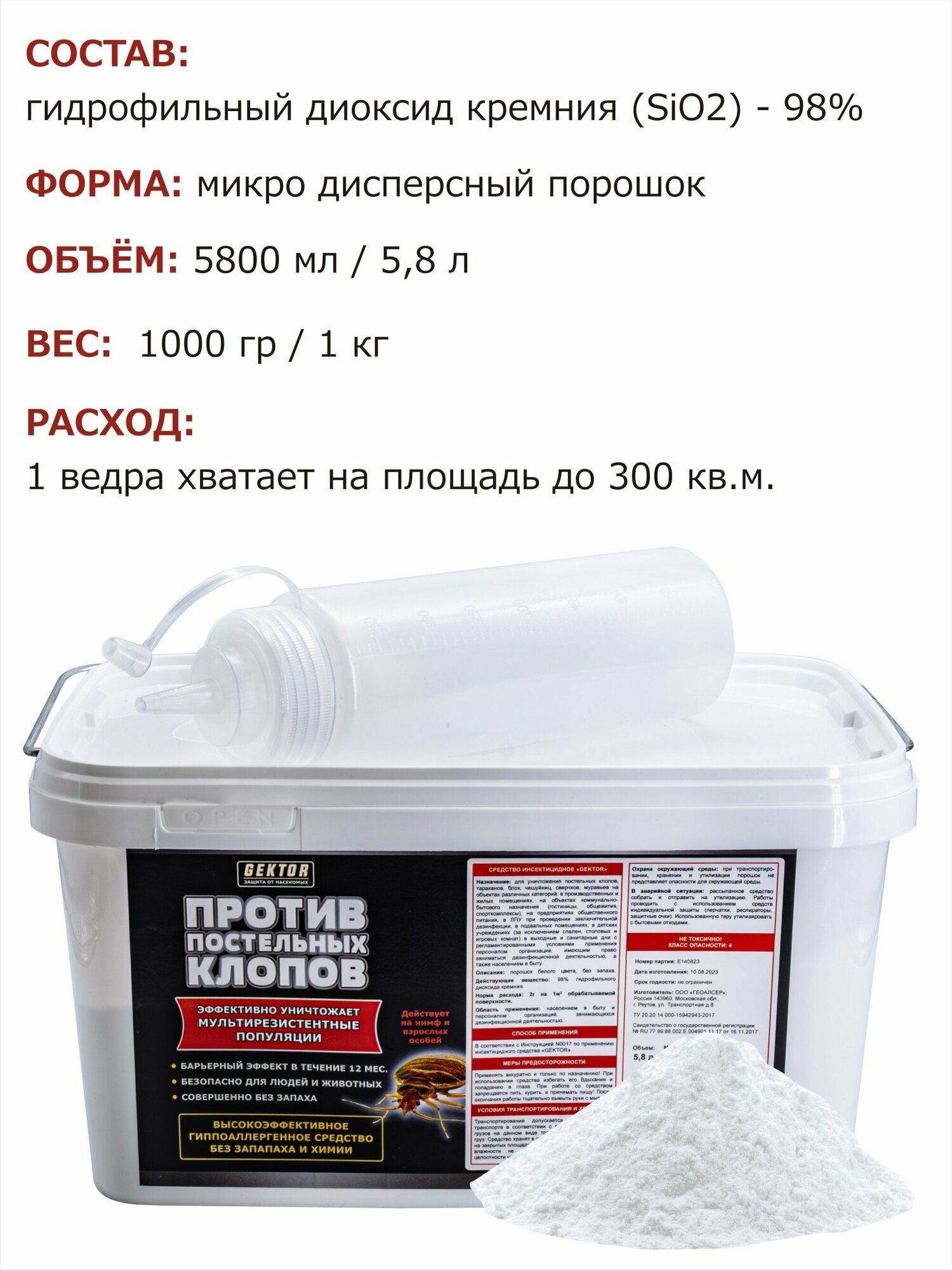Порошок GEKTOR против постельных клопов, 1000 г, 5800 мл