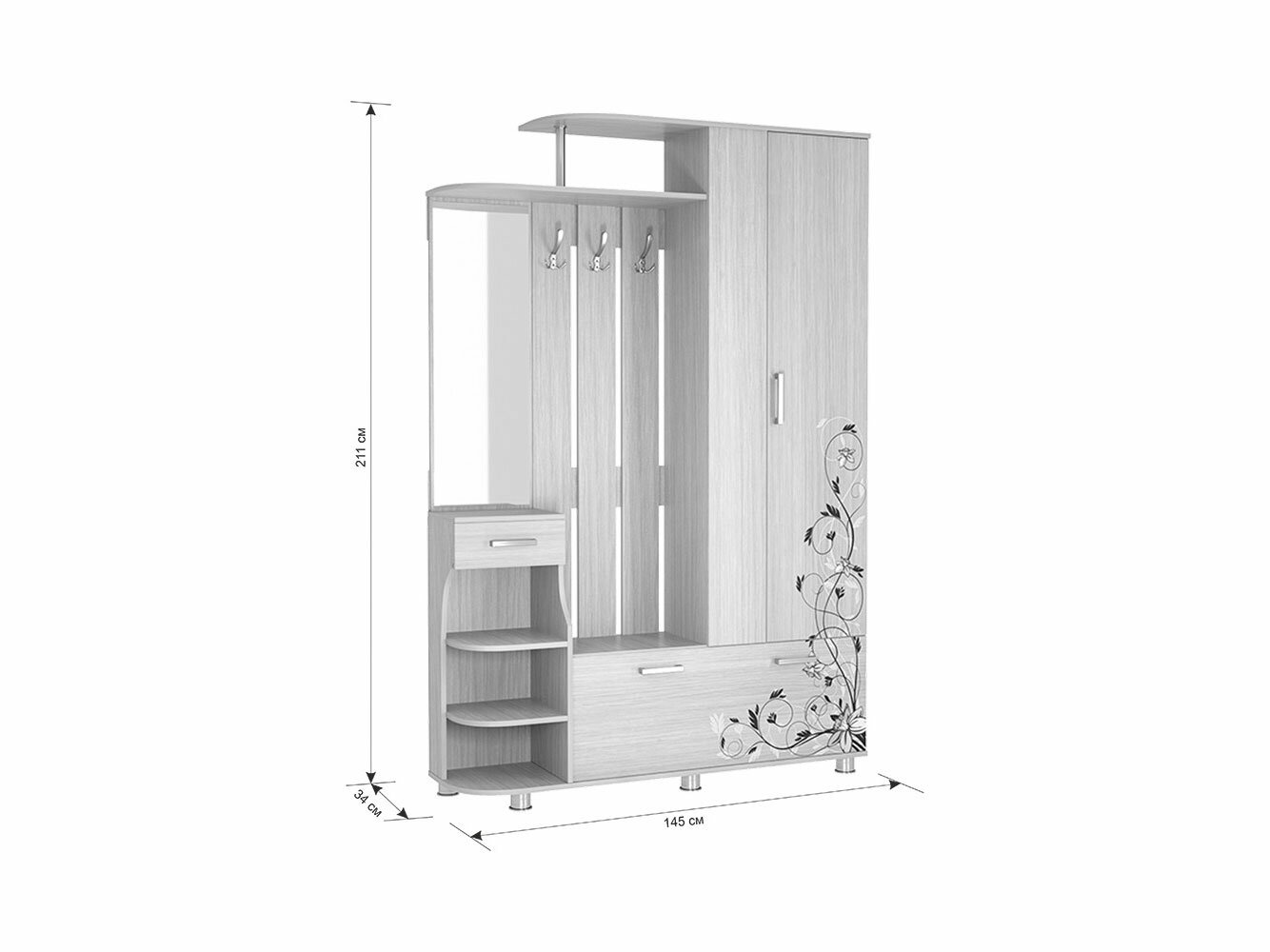 Узкая прихожая "Барселона-2" с зеркалом, 145*34*211 см., цвет Дуб сонома с рисунком, Mebelson