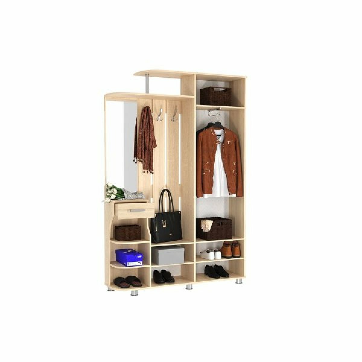 Прихожая комплект САША-6 (правая) от Фант-Мебель, с зеркалом, с обувницей, шкафом и ящиками, 156x203,6x43 см. Ясень темный/Ясень светлый