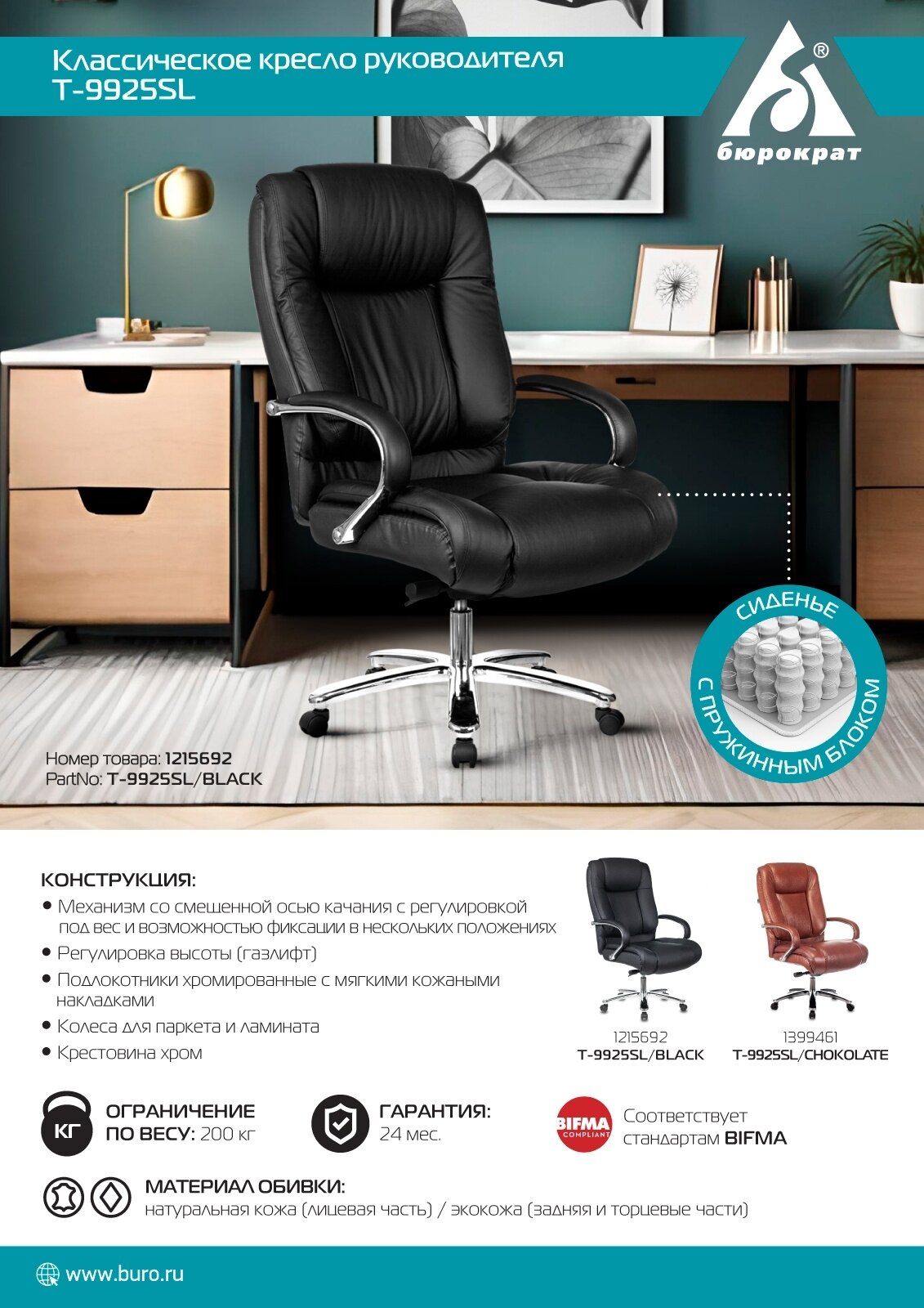 Кресло руководителя Бюрократ T-9925SL, на колесиках, кожа, черный [t-9925sl/black]