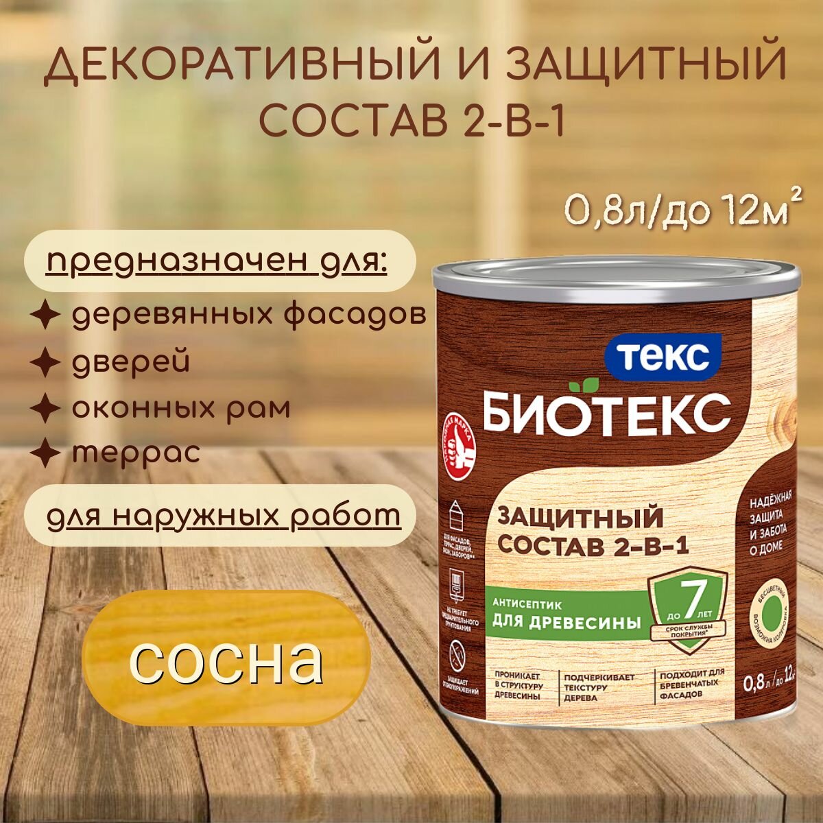 Защитный Состав 2-в-1 Текс Bioteks 0.8л Сосна, не Требует Предварительного Грунтования для Наружных Работ / Текс Биотекс.