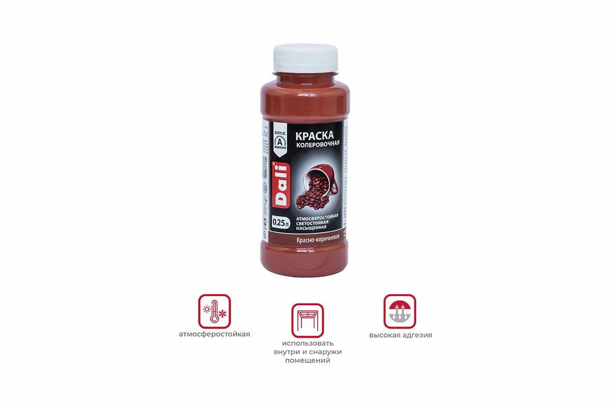 Ниже Вы можете прочитать отзывы на Краска акриловая, колеровочная Dali (0,25л) красно- коричневый, ознакомится с подробными характеристиками, посмотреть интересные обзоры и фотографии на Краска акриловая, колеровочная Dali (0,25л) красно- коричневый.