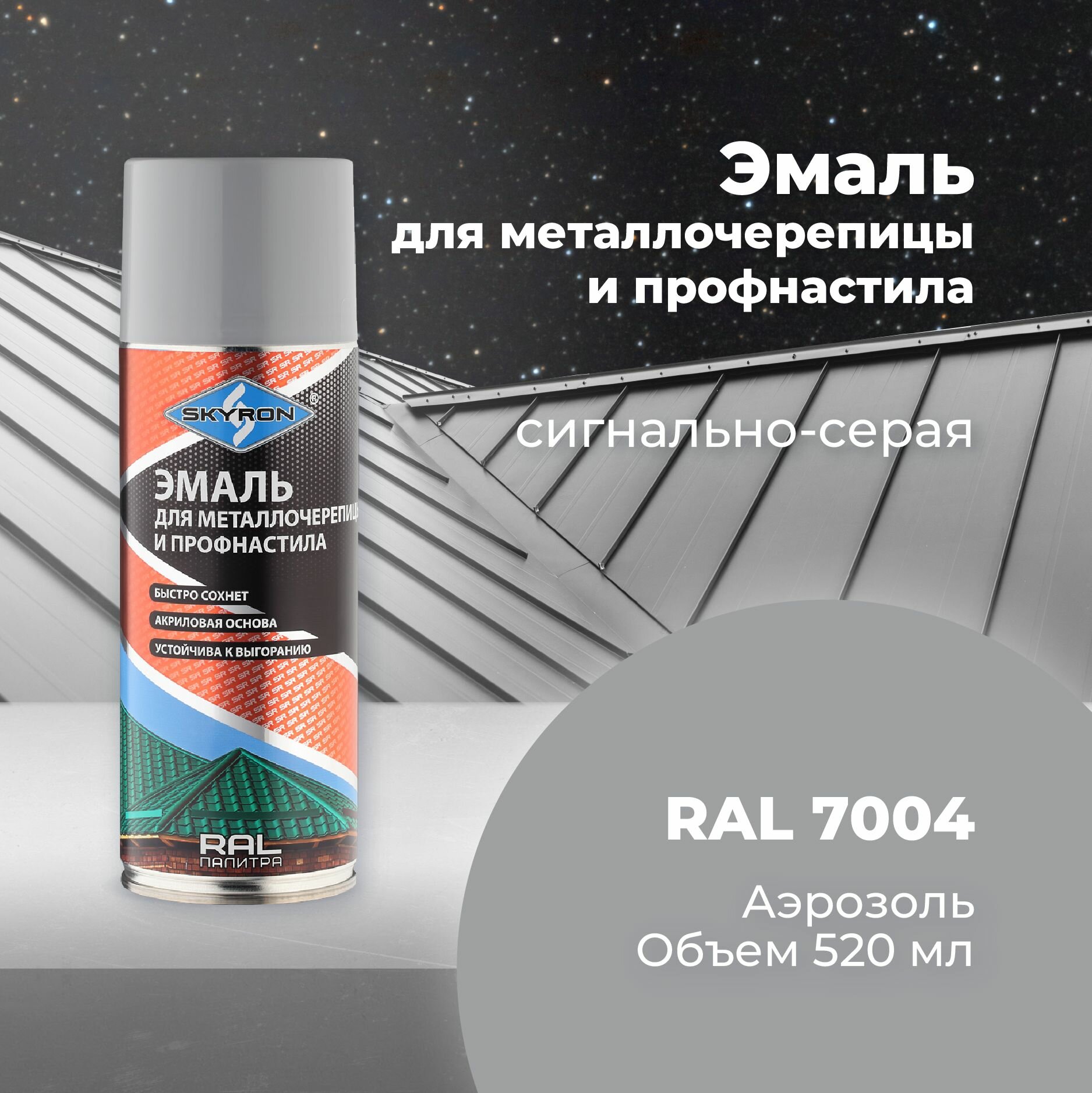 Краска Серая сигнальная SKYRON SR-47004 для металлочерепицы и профнастила 520мл аэрозоль, SR47004 SKYRON SR-47004