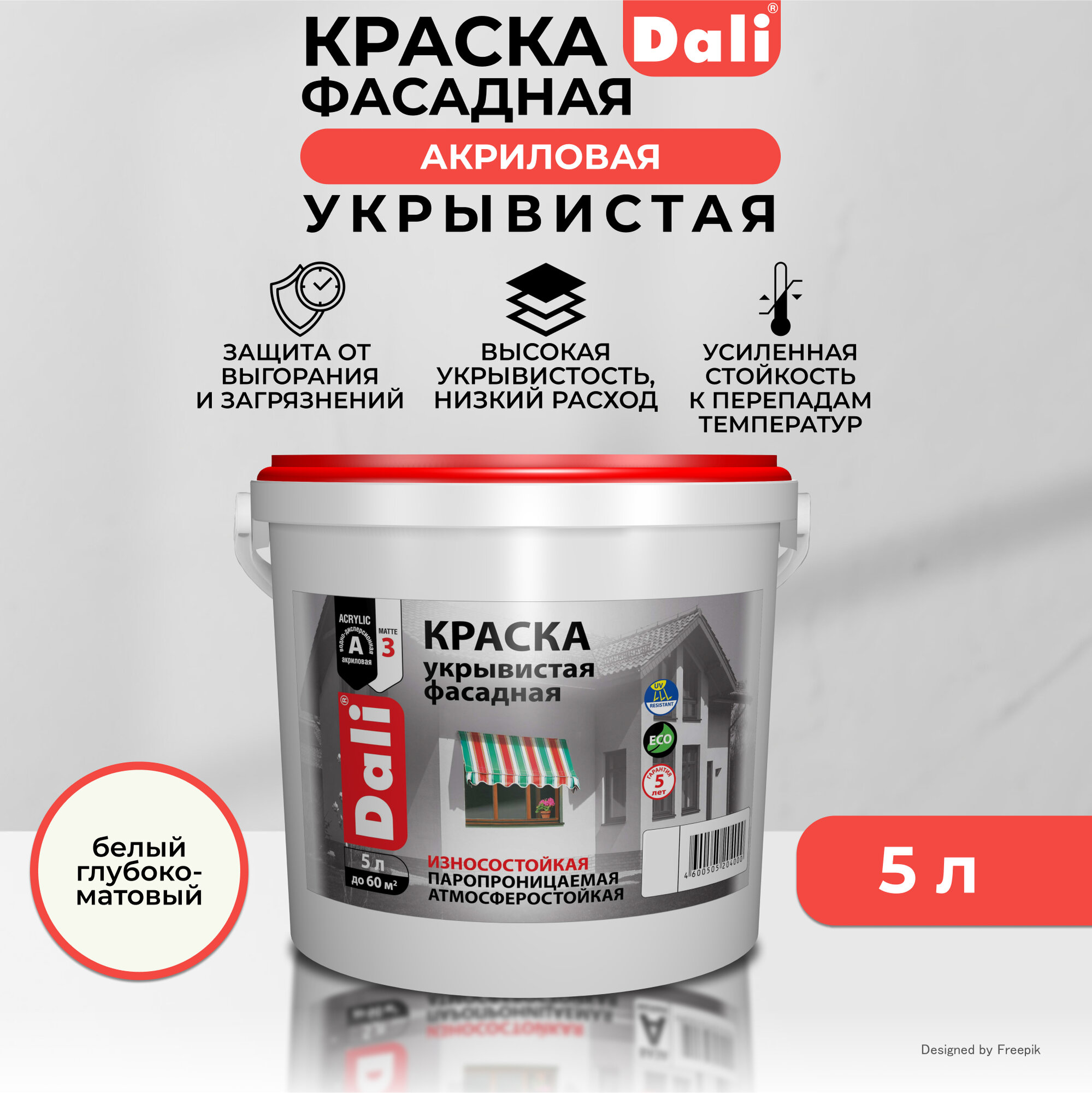 Краска фасадная укрывистая Dali, акриловая, глубокоматовая, белая, 5 л