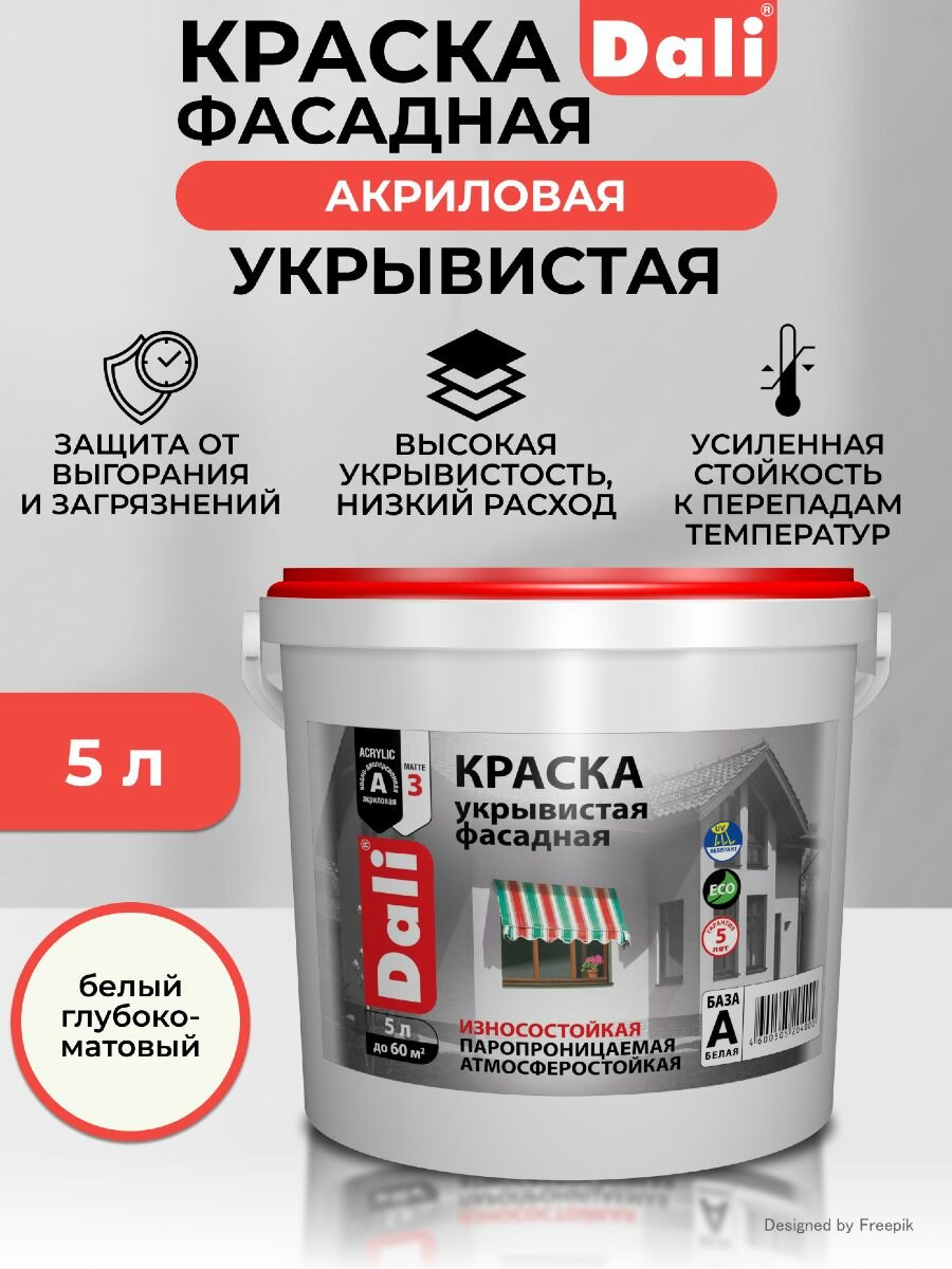 Краска фасадная укрывистая Dali, акриловая, глубокоматовая, белая, 5 л