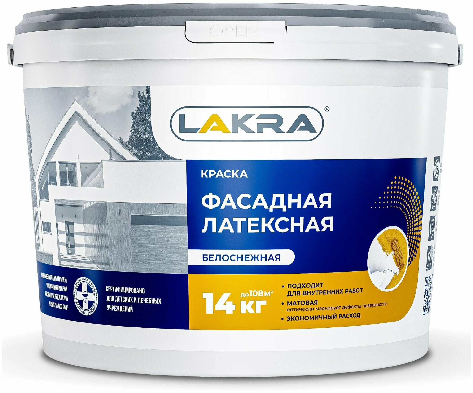 Краска латексная Лакра фасадная моющаяся матовая белоснежный 14 кг