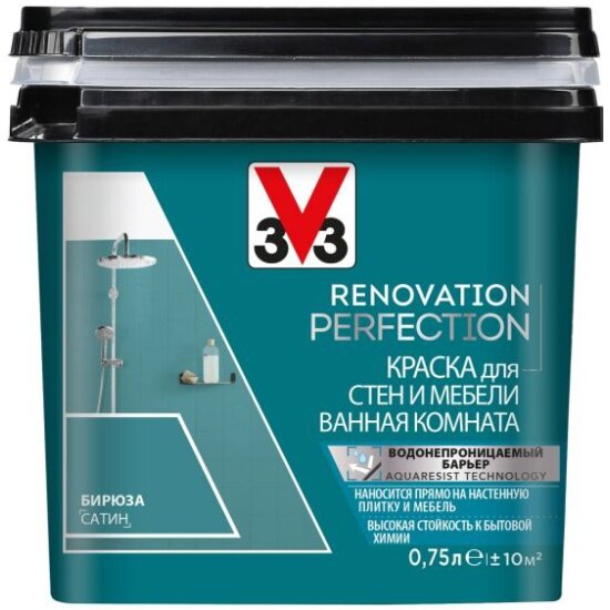 Купить Краска V33 RENOVATION PERFECTION 119709, для стен и мебели ванной комнаты, бирюза, 0,75л