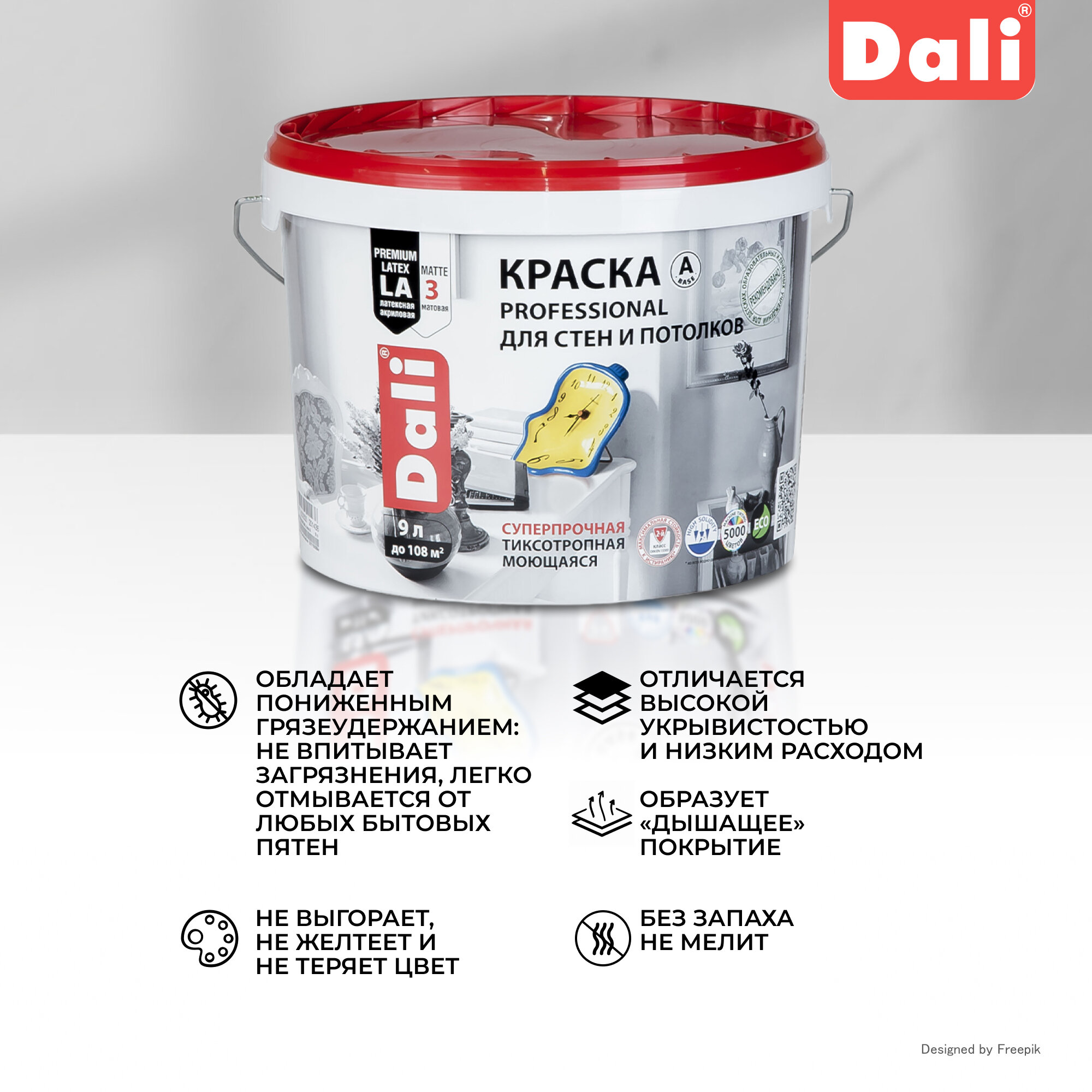 Ниже Вы можете прочитать отзывы на Краска для стен и потолков Dali Professional, акриловая, глубокоматовая, база A, супербелая, 9 л, ознакомится с подробными характеристиками, посмотреть интересные обзоры и фотографии на Краска для стен и потолков Dali Professional, акриловая, глубокоматовая, база A, супербелая, 9 л.