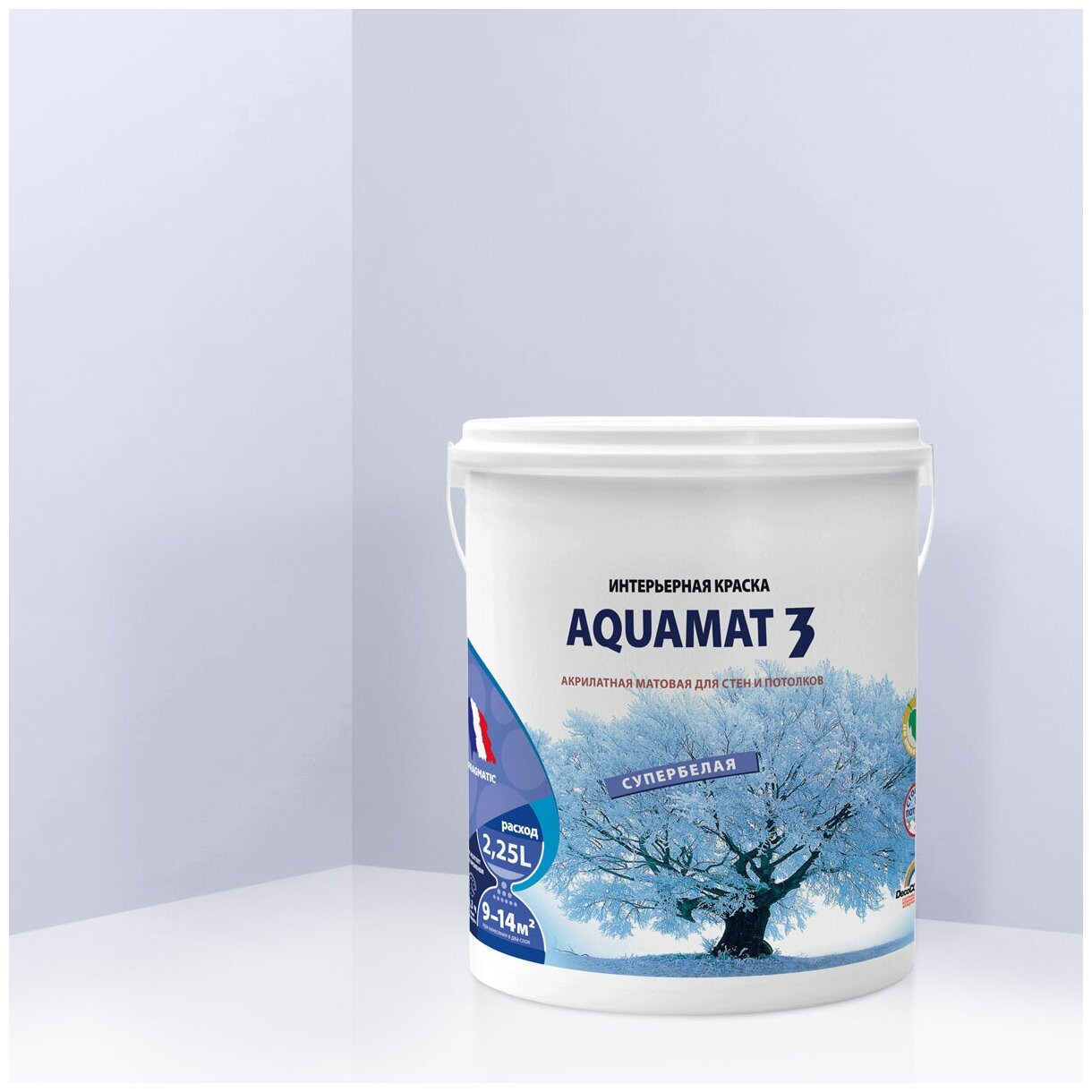 Краска матовая быстросохнущая, водоэмульсионная для стен, потолков и обоев под окраску – AQUAMAT 3 объём 2.25л, цвет Белый