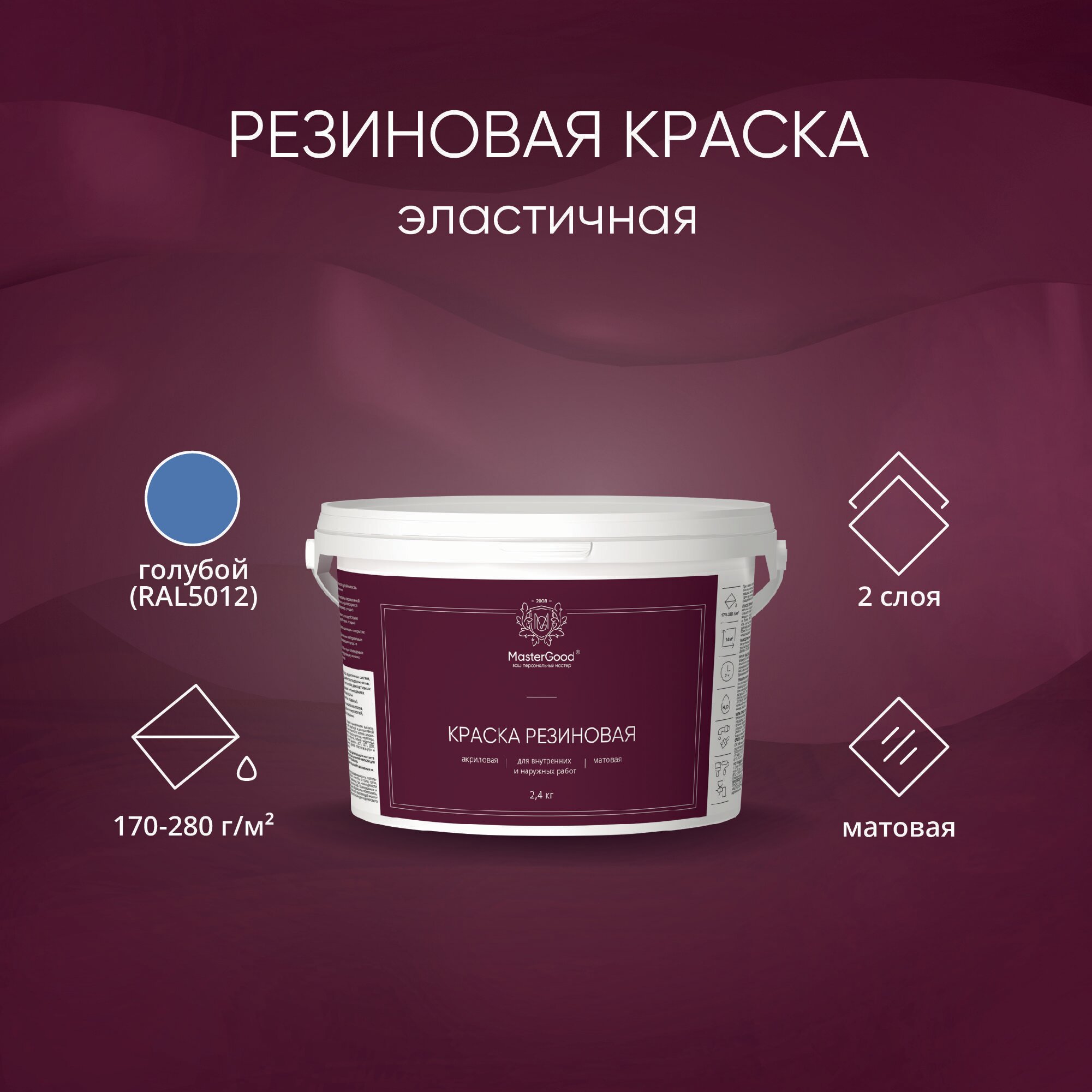 MasterGood Краска резиновая моющаяся акриловая для помещений с повышенной влажностью Голубая (RAL 5012) (2,4 кг) / Для потолков, стен и фасадов, для ванной, кухни, гостиной