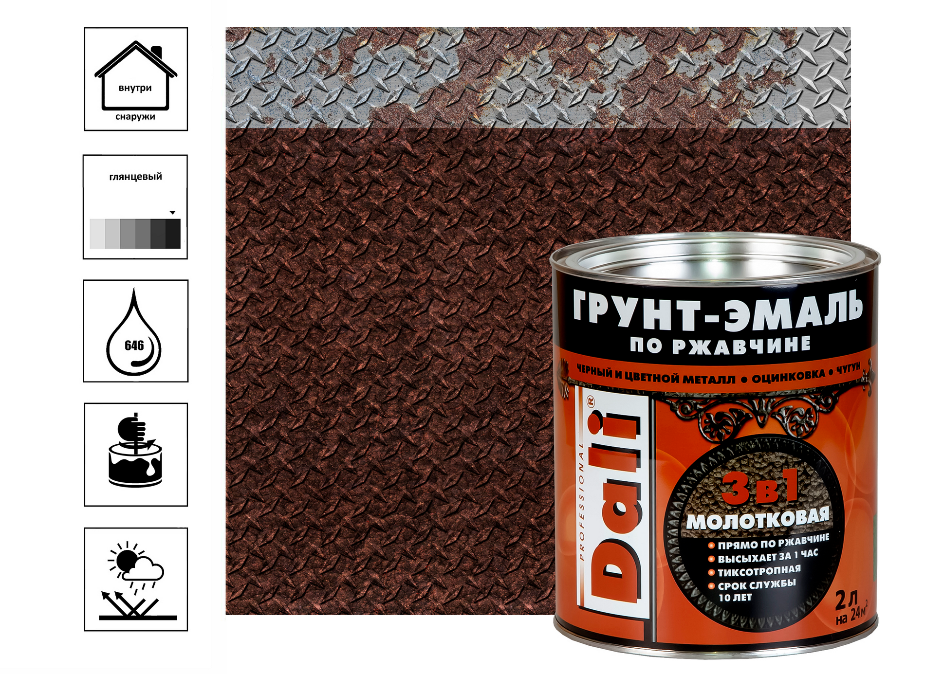 Dali / Дали Грунт-эмаль по ржавчине 3 в 1 молотковая алкидная шоколадная 2л