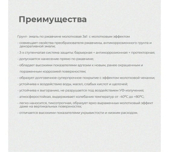 Из минусов - при окраске кистью какой-то огромный расход, у меня вышел в 2 раза выше чем максимальный из инструкции. Там куда должно было хватить 1,5 банки, не хватило двух. Рекомендовал бы купить преобразователь ржавчины отдельно и обработать после минимальной механической очисткой перед окраской, благо он стоит копейки, тогда и расход будет меньше и держаться будет лучше |