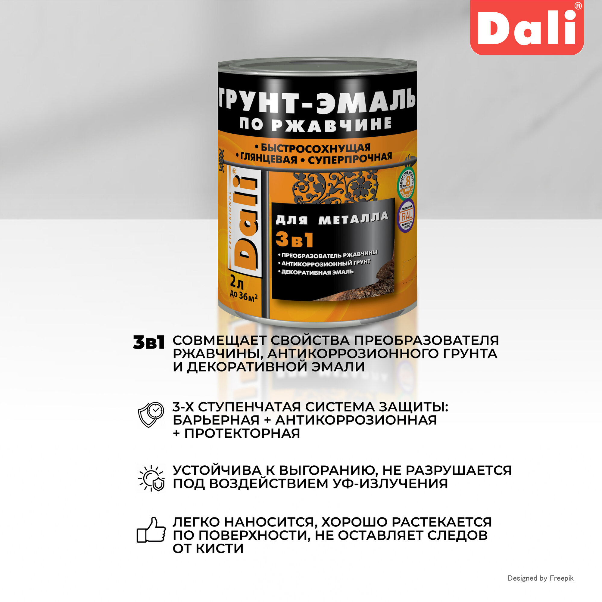 Грунт-эмаль по ржавчине Dali 3 в 1, глянцевая, 2 л, черная