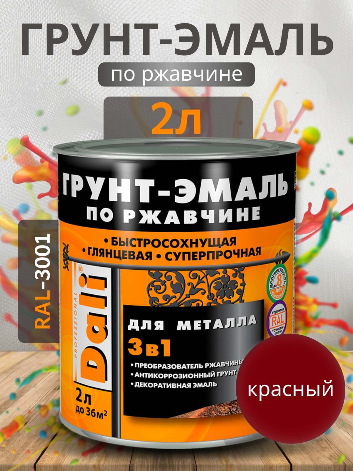 Dali / Дали Грунт-эмаль по ржавчине 3 в 1 гладкая алкидная RAL 3001 красный 2л