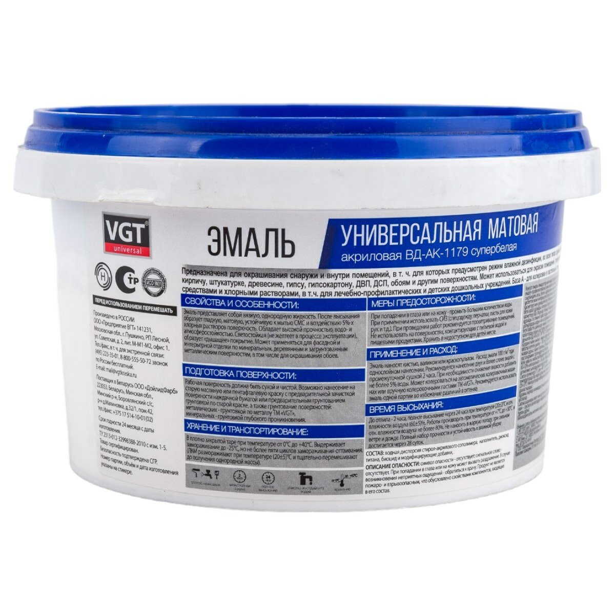 VGT ВД-АК-1179 эмаль акриловая матовая, универсальная, база А, супербелая (0,8кг)