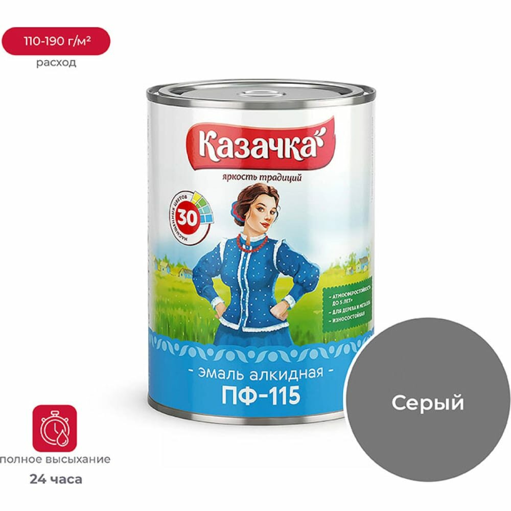 Купить Эмаль ПФ-115 алкидная Казачка, глянцевая, 0,9 кг, серая