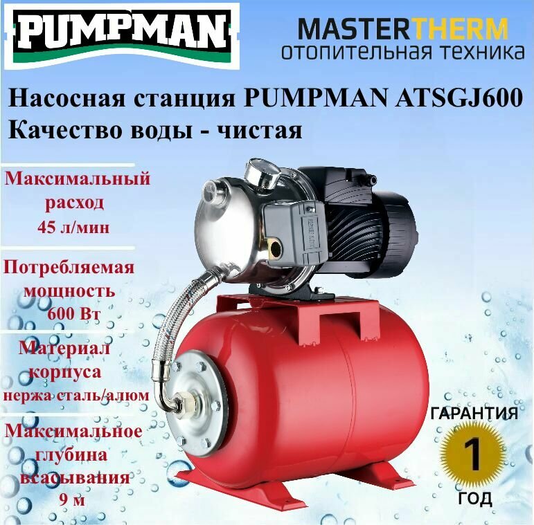 Станция насосная PUMPMAN нерж, 600Вт, Hmax-46м, Qmax-50л/мин, всас 9м, г/а 24л, арт. ATSGJ600