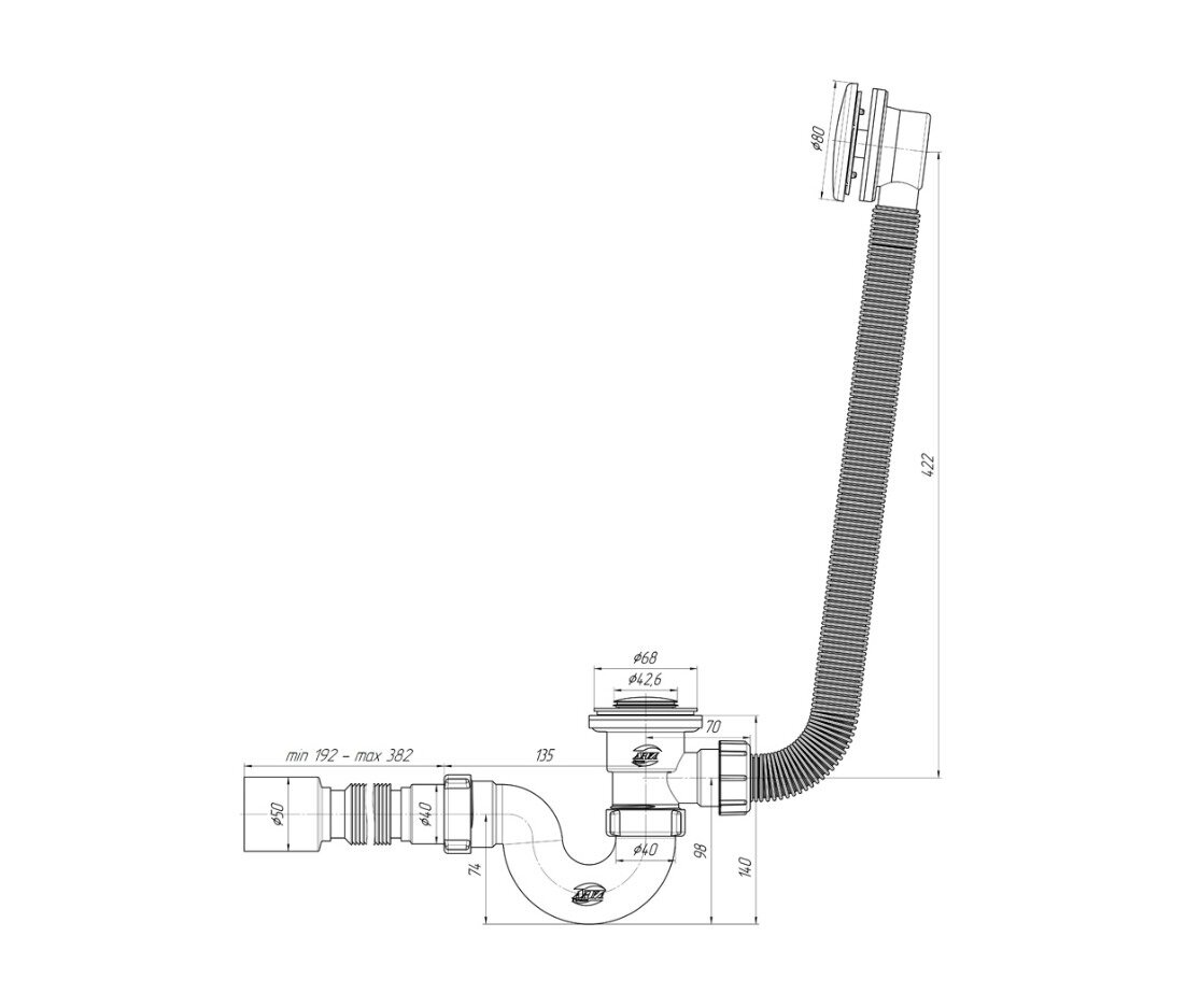 Сифон для ванны АНИ пласт EC155S, автомат, прямоточный, с отводной гибкой трубой 40х50х375мм, с сеткой