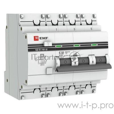 Дифференциальный автоматический выключатель АД32 3 полюс+N, 32А, Тип AC, х-ка C, 30мА | код. DA32-32-30-4P-pro | EKF ( 1шт. )