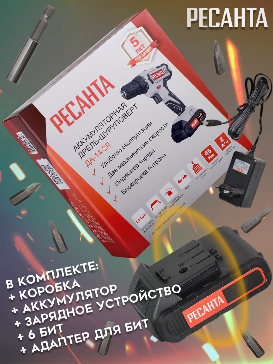 Шуруповерт аккумуляторный ДА-14-2Л РЕСАНТА / 14,4В / дрель-шуруповёрт для дома и дачи