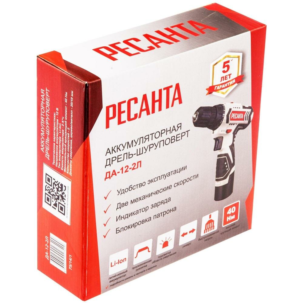 Дрель-шуруповерт "Ресанта" ДА-12-2Л, 12 В, 2 Ач, Li-Ion, 40 Нм, 400/1400 об/мин