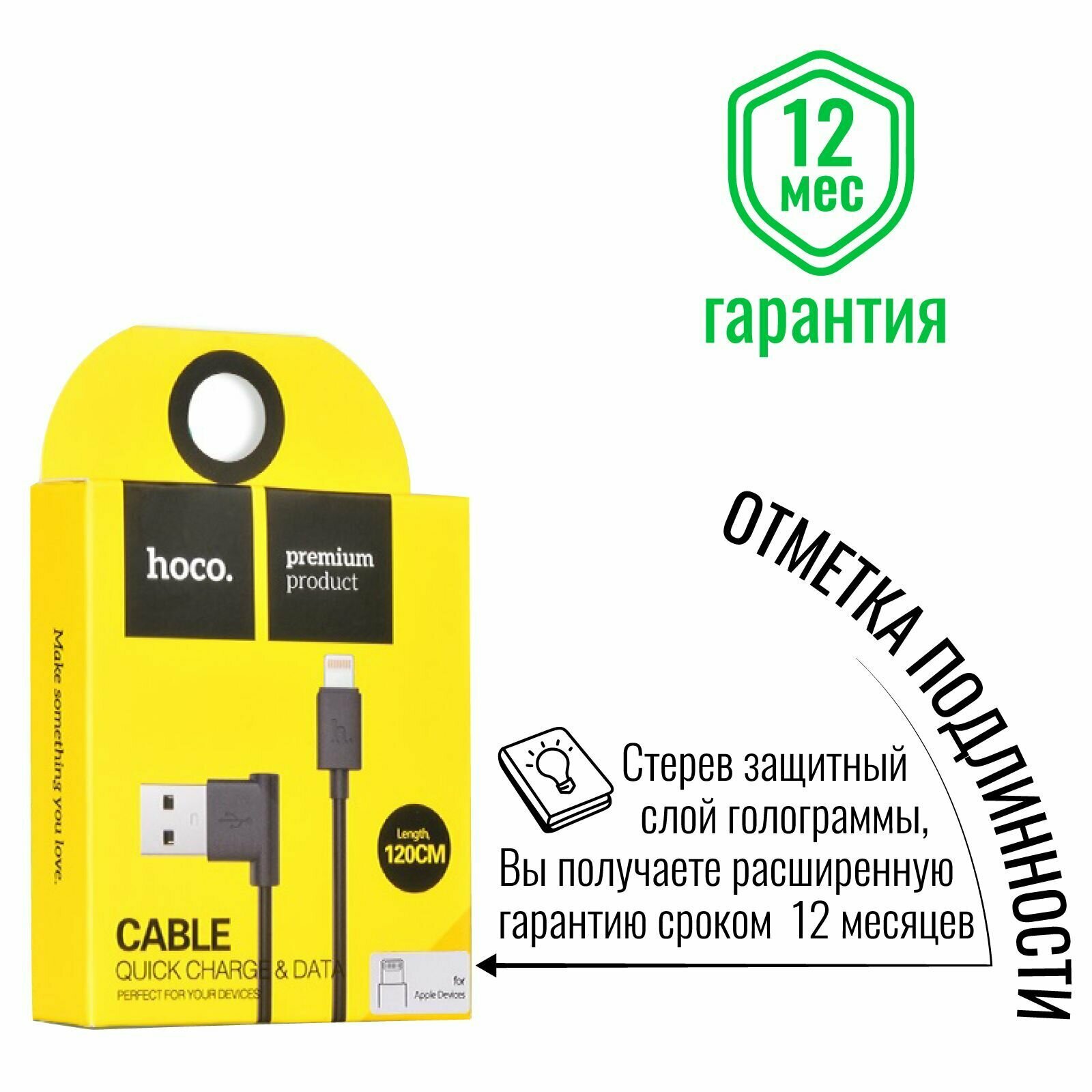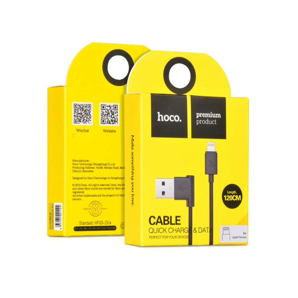 Кабель USB HOCO UPL11 L Shape, USB - Lightning, 2.1А, 1.2 м, черный, L-образный