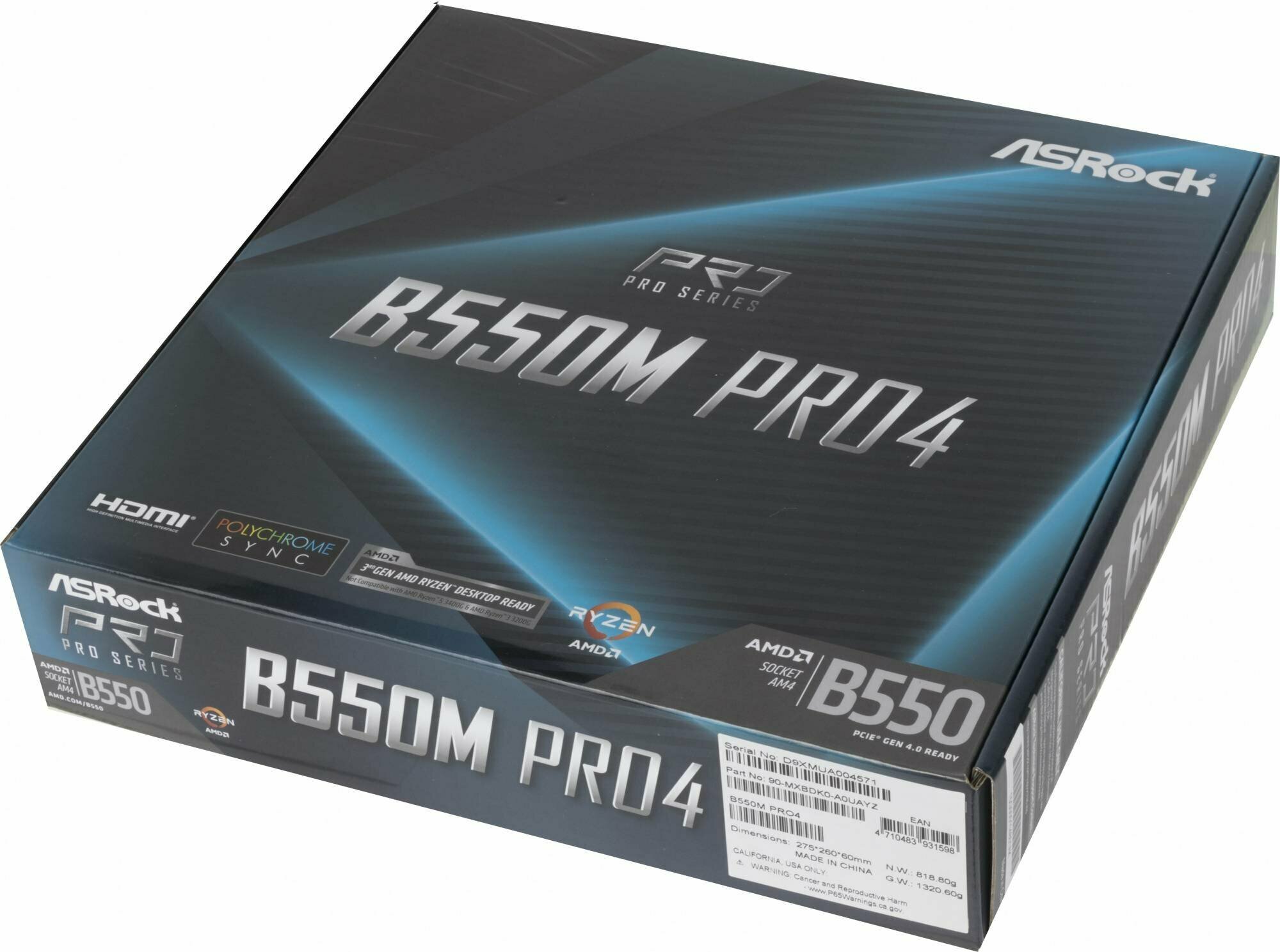 Материнская плата ASROCK B550M PRO4, AM4, B550, 4*DDR4, D-Sub+HDMI+DP, 6xSATA3 6.0 (RAID), M.2 Socket, 4xUSB 3.2, 2xUSB 2.0,