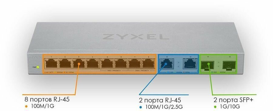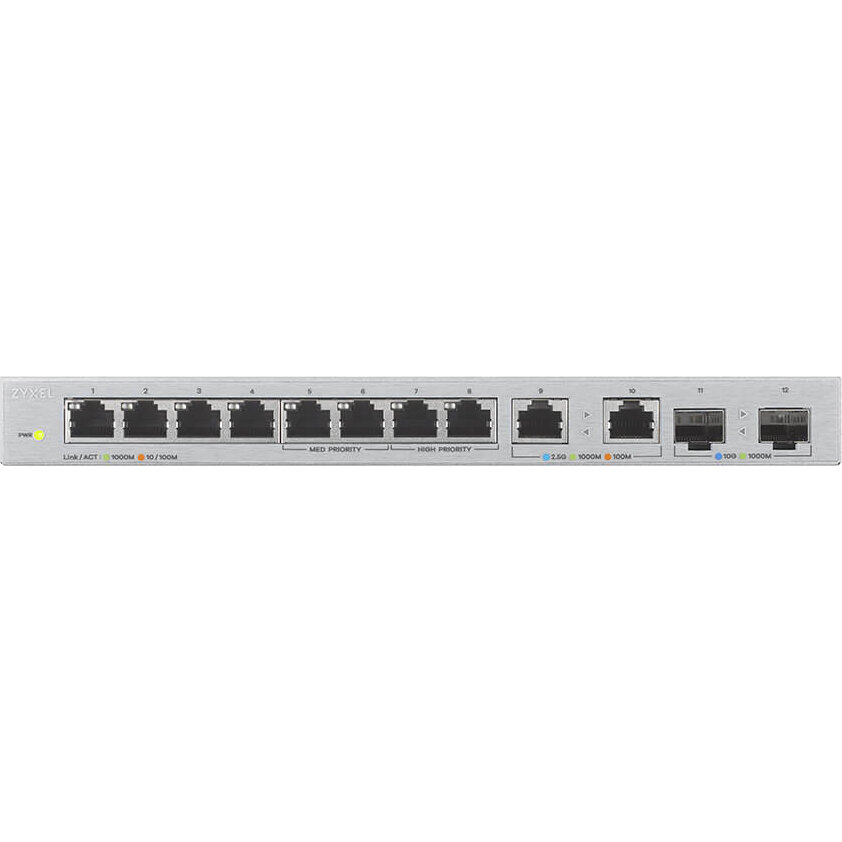 Коммутатор Zyxel XGS1010-12, 8xGE, 2x1/2,5GE, 2xSFP+, настольный, бесшумный