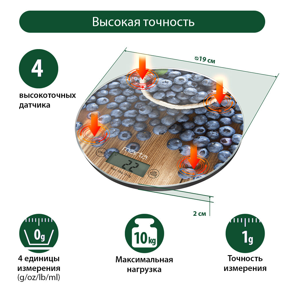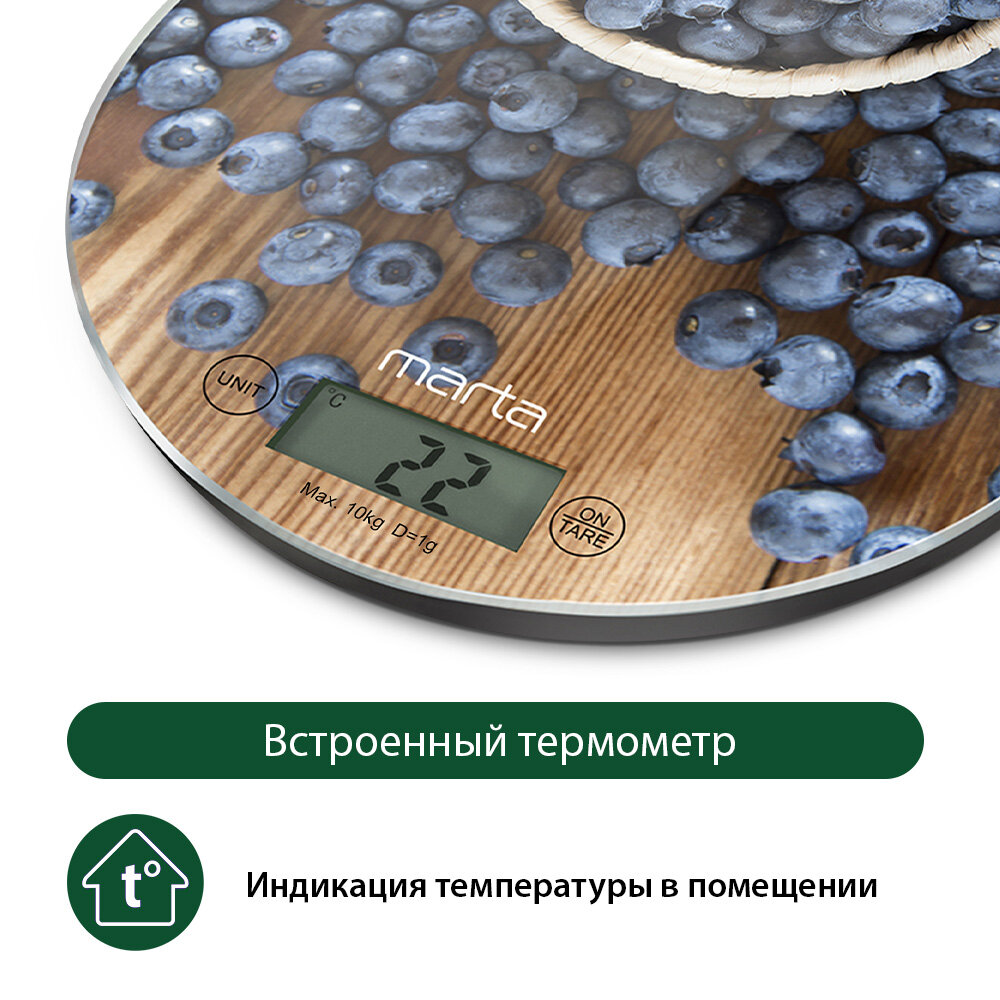 Купить Весы кухонные MARTA MT-1640 черничная россыпь сенсор, встроенный термометр