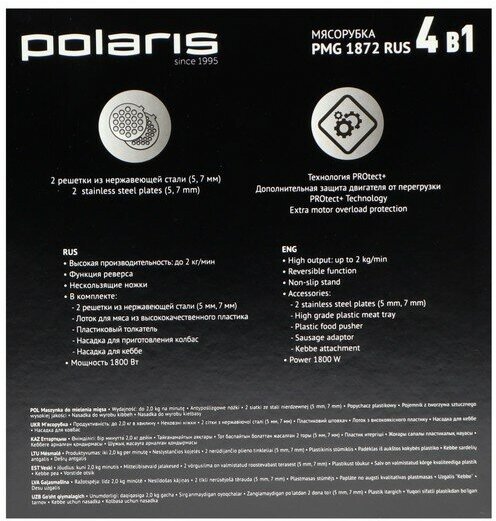Мясорубка электрическая Polaris, PMG 1872, 1800 Вт, реверс, 2 кг/мин, 2 насадки, для колбасок, кеббе, черная