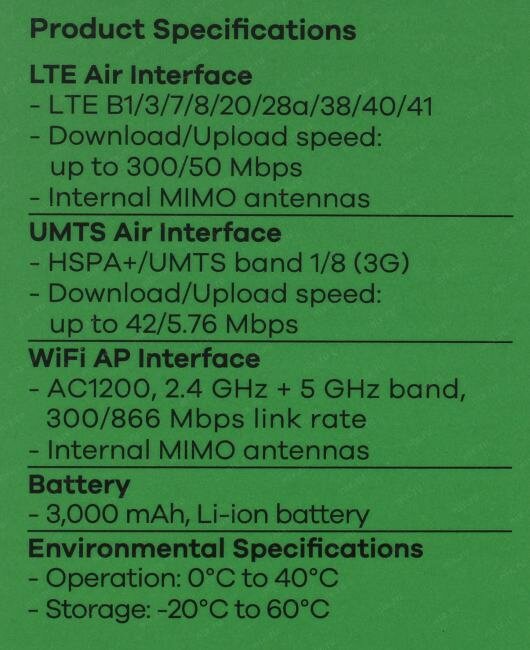 | Плюсы: | Мобильность, наличие 5GHz, поддержка 4G+ до 300 мбит/с, есть возможность работы как по Wi-Fi, так и через провод |