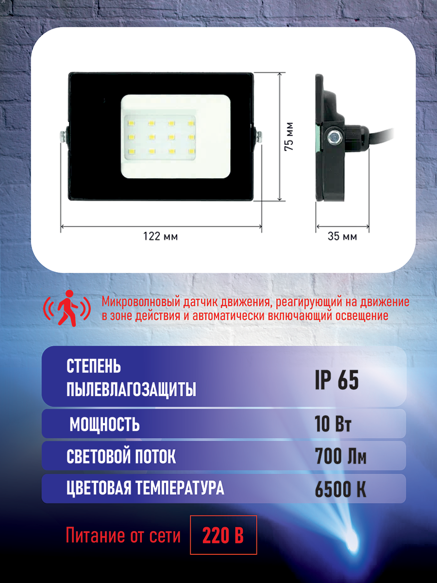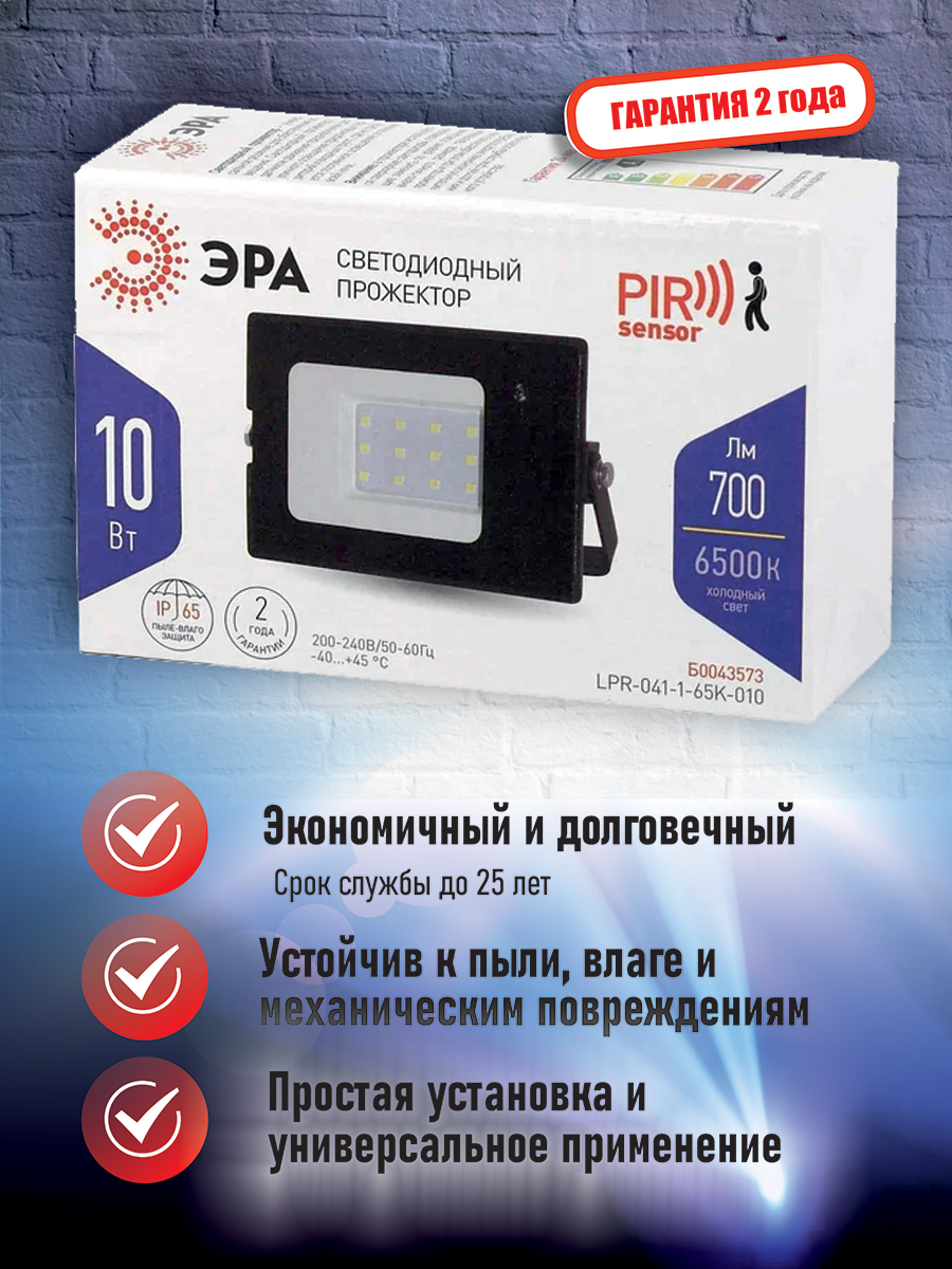 Прожектор светодиодный ДО-10W LPR-041-1-65K-010 10Вт 700Лм 6500К датчик движения нерегулируемый 122x75x35 | код Б0043573 | ЭРА ( 1шт )