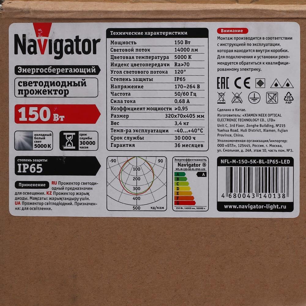 Прожектор светодиодный Navigator NFL-M-150-5K-BL-IP65-LED, 150 Вт, свет: дневной белый