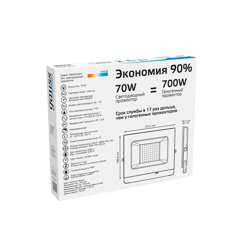 Gauss Прожектор Elementary 70W 7200lm 6500K 175-265V IP65 белый LED