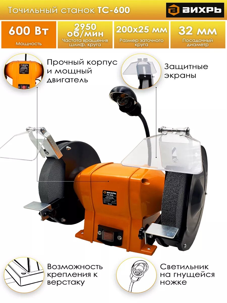Точильный станок ТС-600 Вихрь ( 600 Вт, 2950 об/мин; круг 200*25 мм; посадочный диаметр 32 мм)