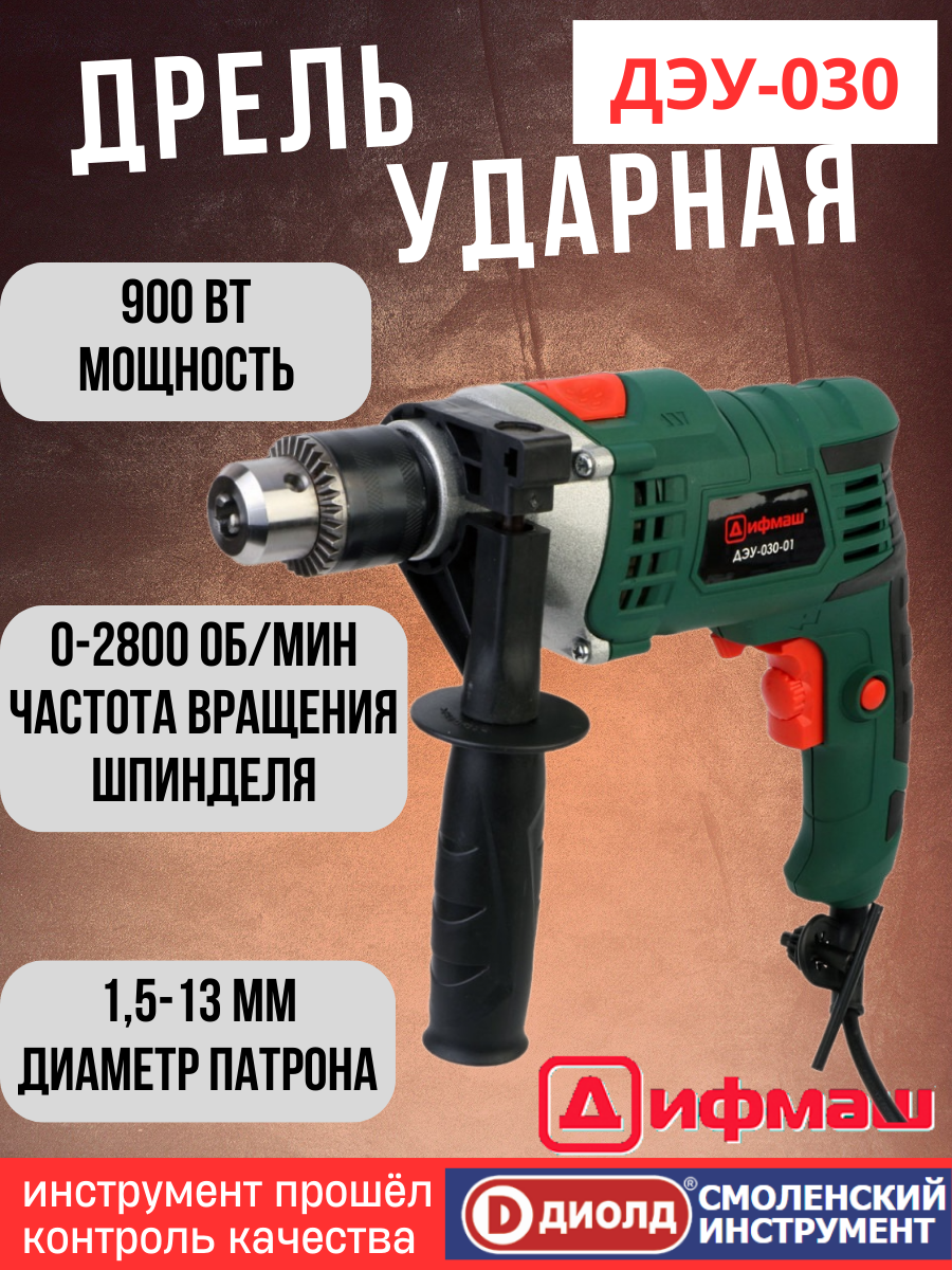 Ударная электрическая дрель Дифмаш ДЭУ-030-01, 900Вт, 0-2800об/мин, реверс, ограничитель, производитель россия