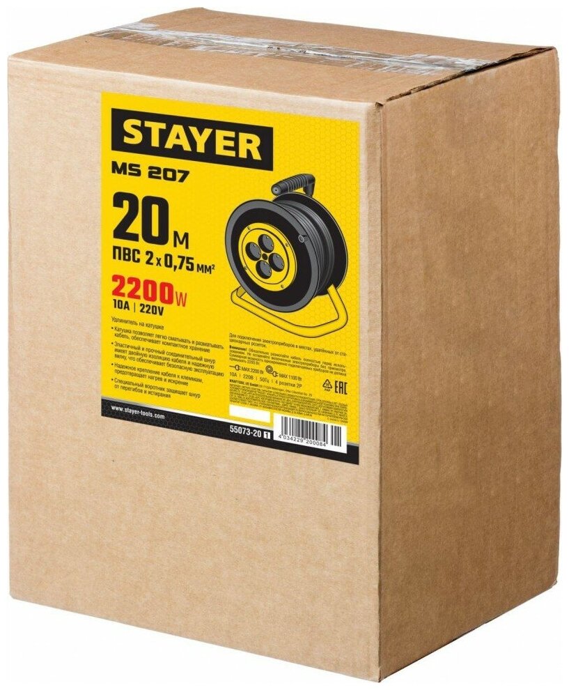 Удлинитель на катушке STAYER MS-207 20 м 2200Вт 4 гнезда ПВС 2х0.75 ммD ( 55073-20_z01 )