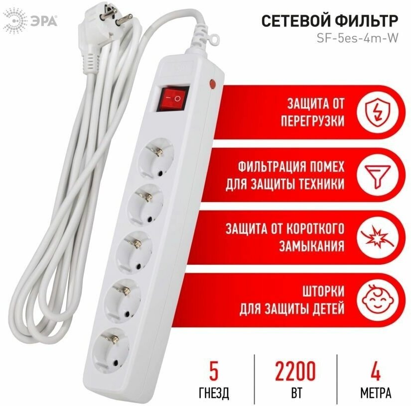 Купить Сетевой фильтр ЭРА SF-5es-4m-W с надежной защитой с заземлением с выключателем 5 розеток 4м 10А белый
