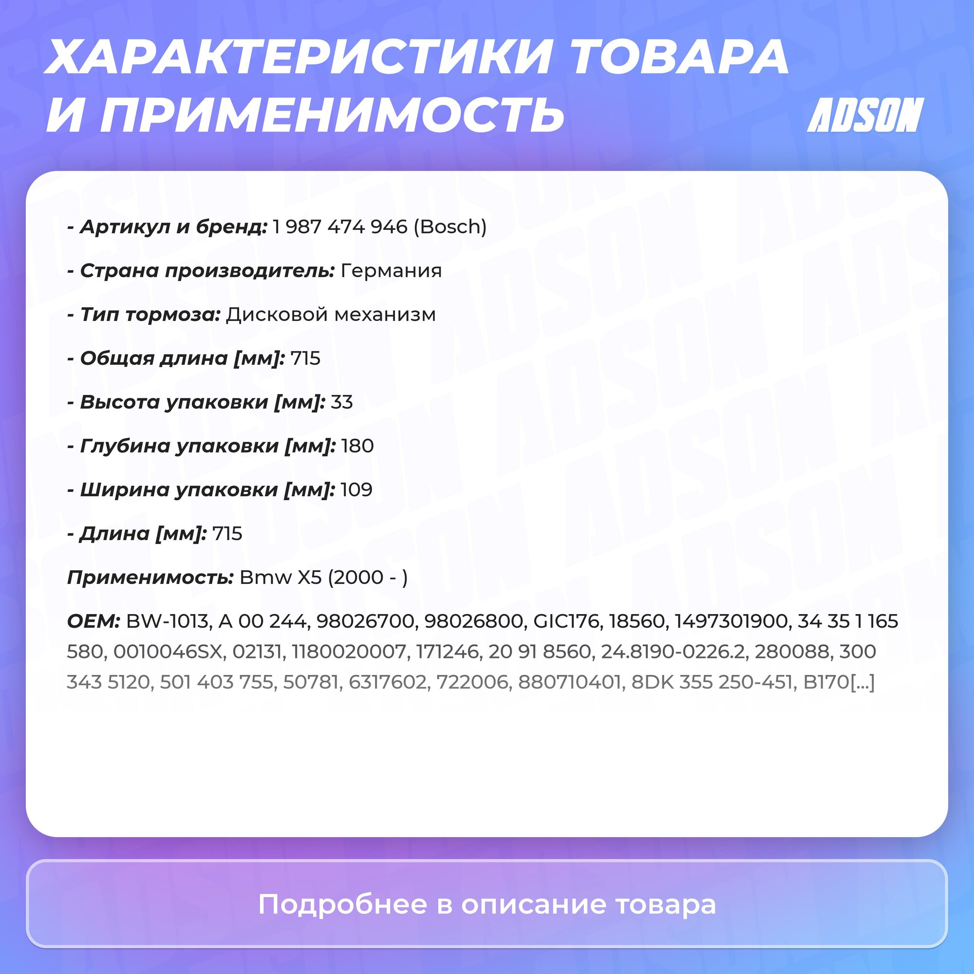 1 987 474 946_=Qbws0200=18560F [34351165580] !Датчик Износа Колодок Зад Bmw X5 All 00> L=715 Bosch арт. 1987474946