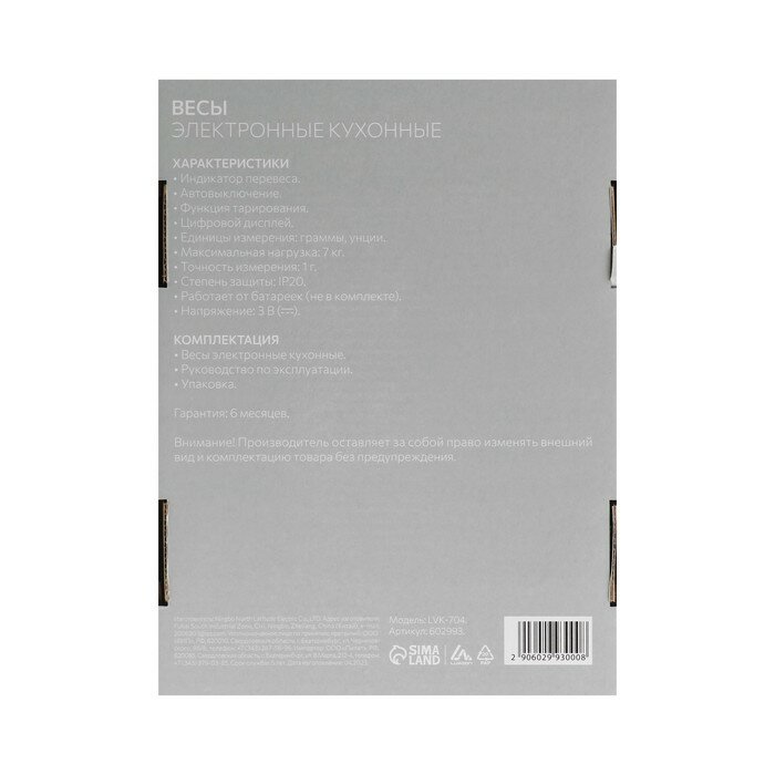 Купить Весы кухонные Luazon LVK-704, электронные, до 7 кг, белые