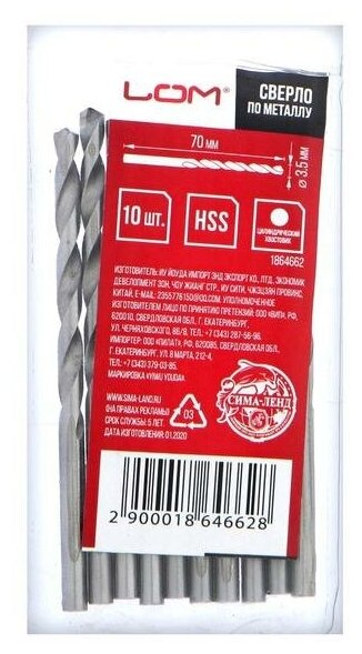 ЛОМ Сверло по металлу ЛОМ, HSS, цилиндрический хвостовик, 3.5 х 70 мм, 10 шт. интересное: