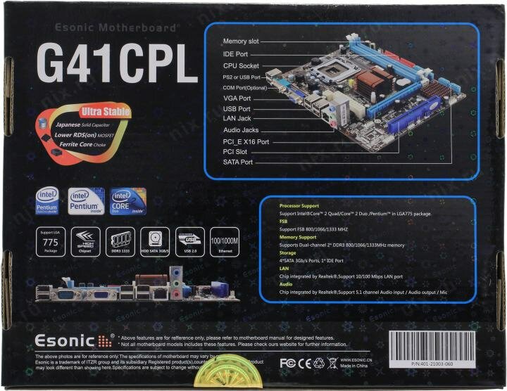 Esonic G41cpl3, Socket 775, IntelG41+ICH7, 2xDDR3-1333, D-sub, 1xPCI-Ex16, mATX, RTL .