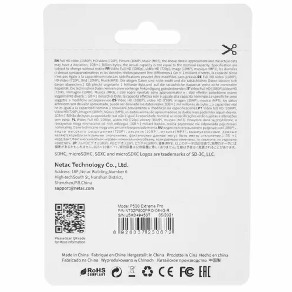 MicroSDHC 64Gb Netac P500 Extreme Pro A1 V10 Class 10 Uhs-i (u1), Nt02p500pro-064g-r, R100Mb/s, SD а .