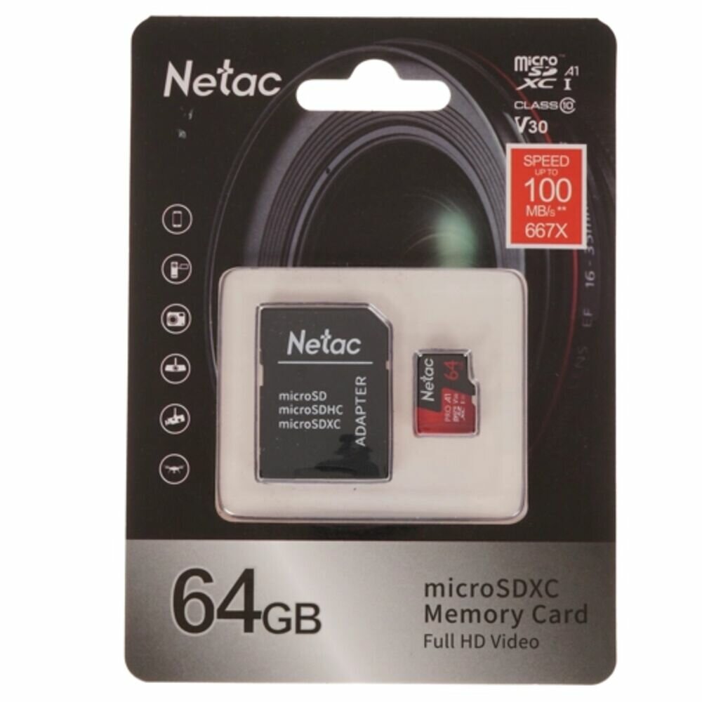 Карта памяти Netac microSDXC 64 ГБ Class 10, V30, A1, UHS-I U3, R 100 МБ/с, 1 шт., черный/красный