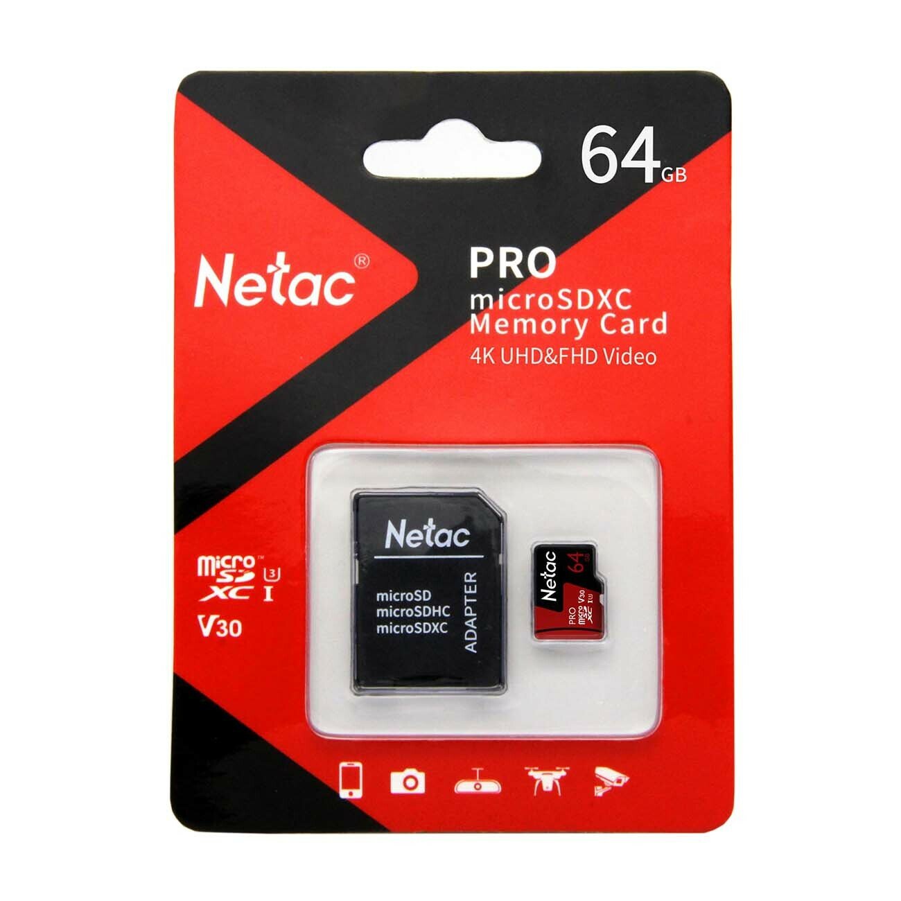 Карта памяти Netac microSDXC 64 ГБ Class 10, V30, A1, UHS-I U3, R 100 МБ/с, 1 шт., черный/красный