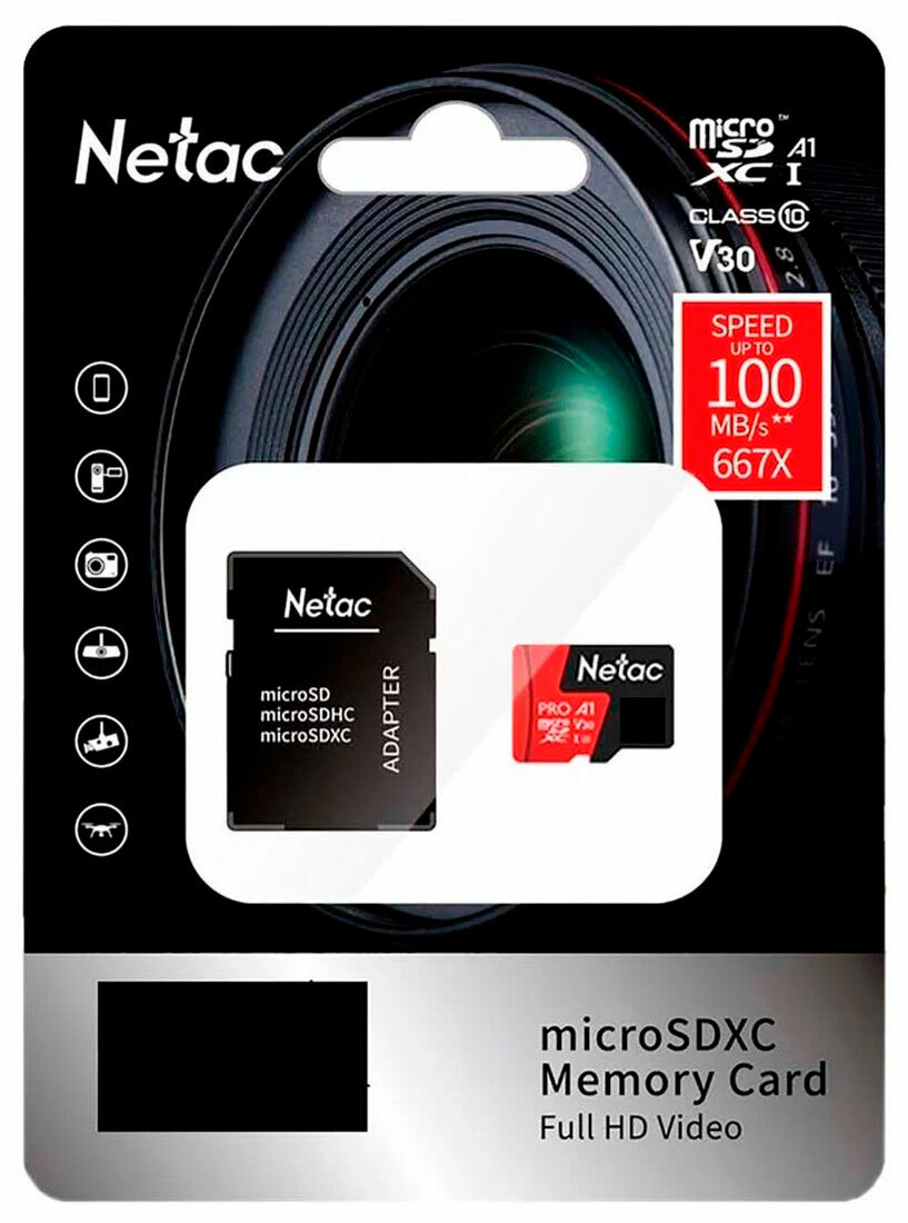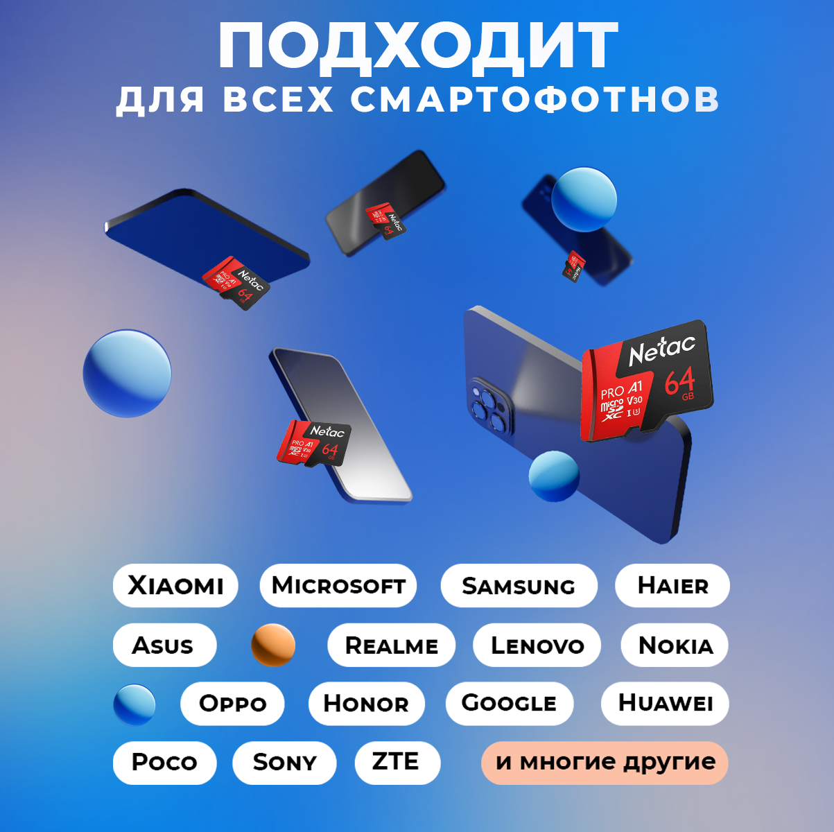MicroSDHC 64Gb Netac P500 Extreme Pro A1 V10 Class 10 Uhs-i (u1), Nt02p500pro-064g-r, R100Mb/s, SD а .