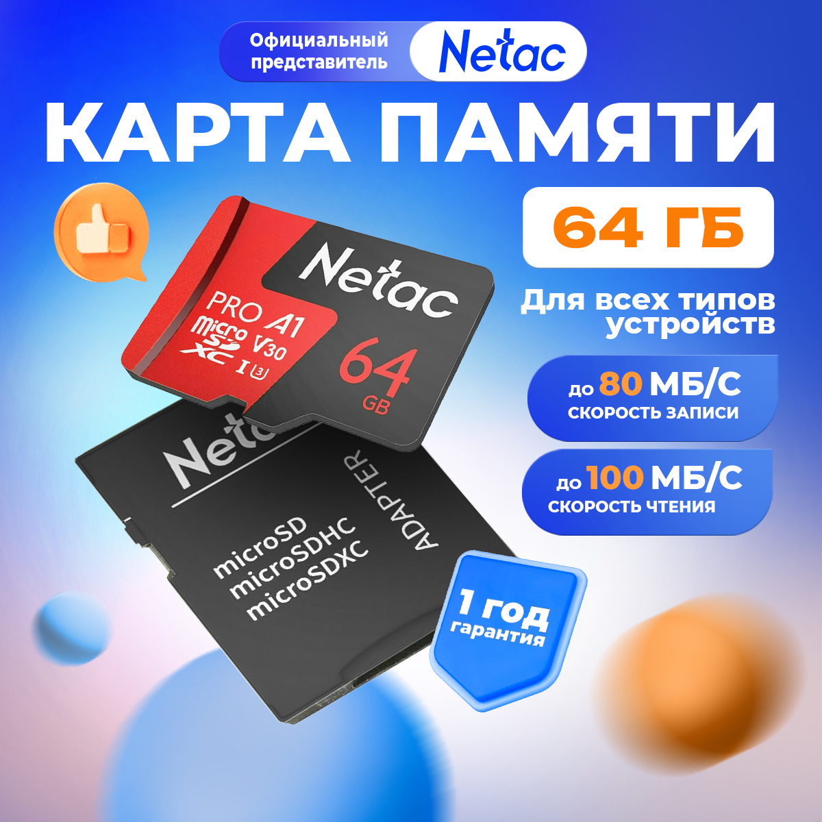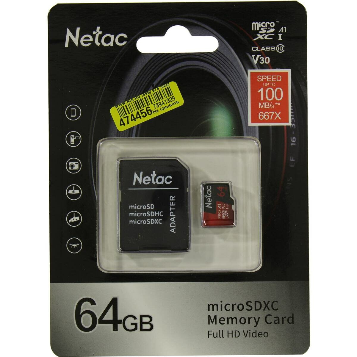 Карта памяти Netac microSDXC 64 ГБ Class 10, V30, A1, UHS-I U3, R 100 МБ/с, 1 шт., черный/красный