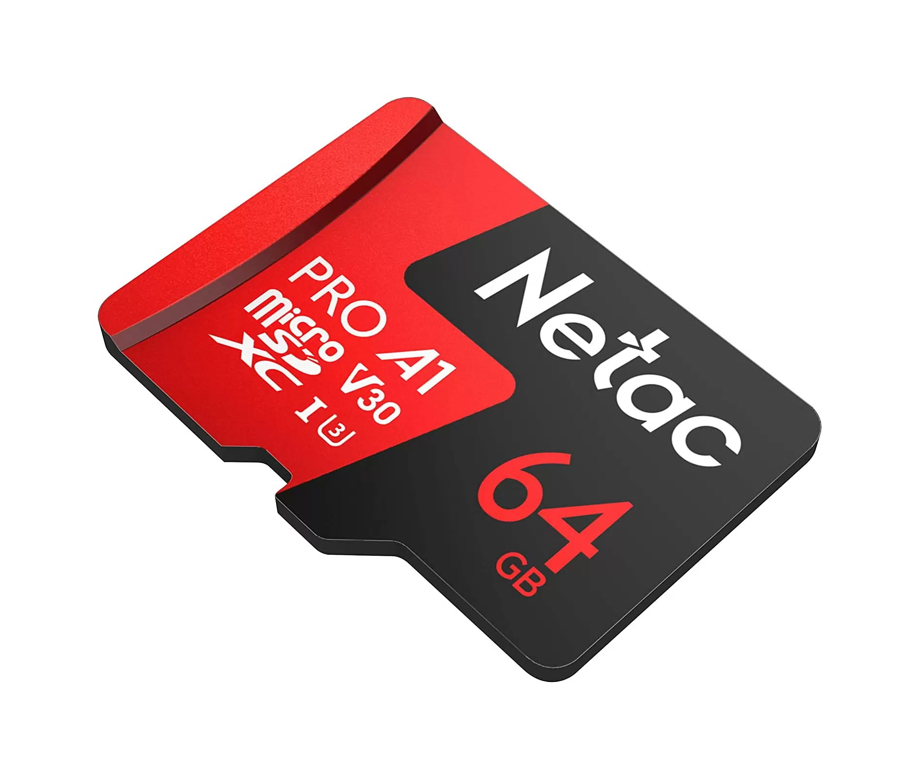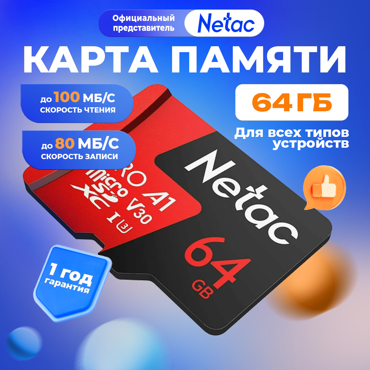 Карта памяти Netac microSDXC 64 ГБ Class 10, V30, A1, UHS-I U3, R 100 МБ/с, 1 шт., черный/красный