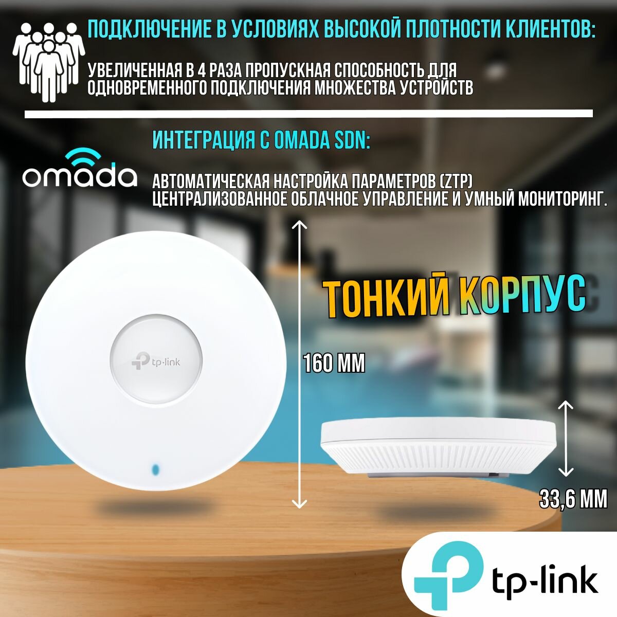 Точка доступа TP-Link 11AX dual-band ceiling access point, up to 1200 Mbit / s at 5 GHz and up to 574 Mbit / s at 2.4 GHz, 1 10/100/1000Mbps LAN port, support PoE 802.3at standard, support BSS coloring, Seamless Roaming, Mesh, Band Steering, Airtime Fairn