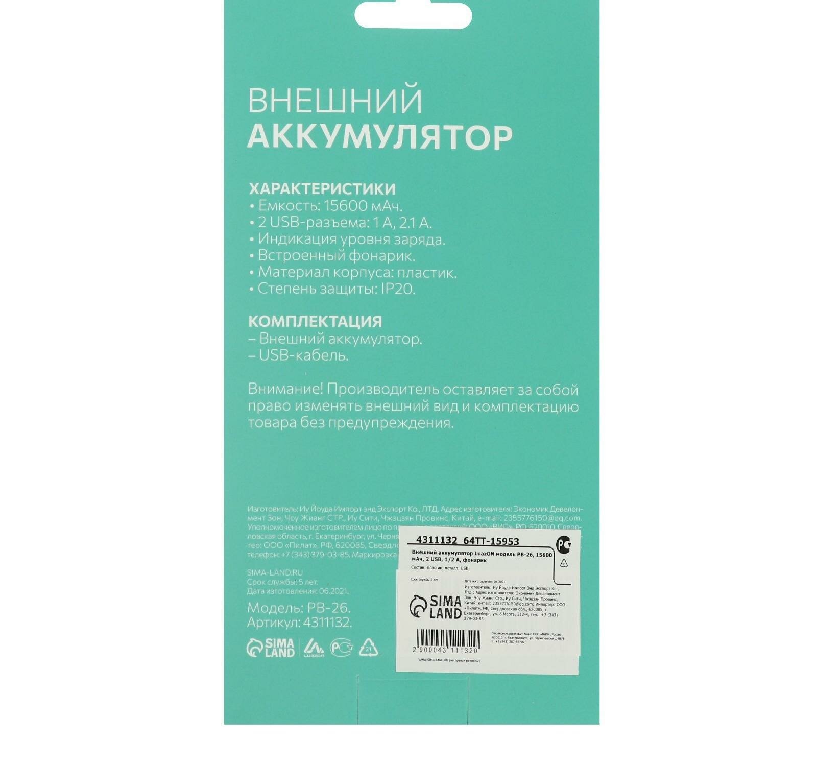 Купить Luazon Home Внешний аккумулятор Luazon PB-26, 15600 мАч, 2 USB, 1/2 А, фонарик, чёрный